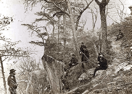 Grant (l.) and his staff on Lookout Mountain, near Chattanooga, Tennessee, November 1863. Library of Congress photo.
