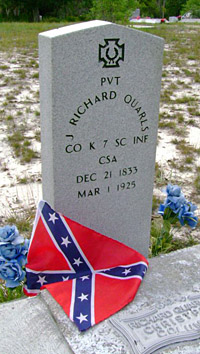 Quarls applied for a pension in Pinellas County, Florida on July 10, 1916. On the first page of the application, he claims that he enlisted in Company K, 7th South Carolina Infantry, at Camp Butler, South Carolina, sometime in 1861. He gives his name upon enlistment as Richard Quarls. He claims to have been discharged in 1865 “near Richmond” Virginia, in 1865, on account of “Lee’s surrender.” The inference is that Quarls served almost the entire war with the 7th South Carolina Infantry. Quarl’s service claims were attested to by two witnesses, T. B. and O. W. Lanier. Both testified to have known Quarls during the war, affirmed his membership in the unit, and that they witnessed his full service as described in the application. These basic elements of his record during the war, claimed on the initial application, appear to have been accepted without question by the SCV, and form the wartime history of Richard Quarls that is now repeated as historic fact, his story being picked up by even non-Civil War authors, including Ann Coulter. (Coulter says Quarls’ grave was unmarked before the installation of the SCV’s stone, which is not true.) In fact, those self-same pension records cast serious doubt on much of what is “known” about Richard Quarls’ service during the Civil War.