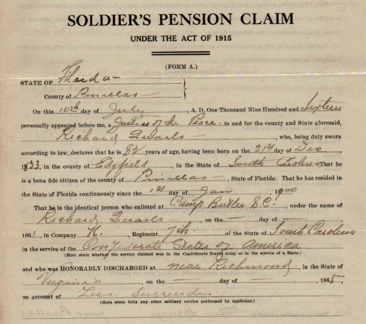 4. Having connected the pension applicant Richard Quarls with the service record of Private J. Richard Quarles, and unaware that Pvt. Quarles died in 1862, the State of Florida awarded Richard Quarls a Confederate Soldier’s pension.