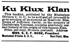 It is a complicated story, indeed. While modern Southron Heritage™ folks insist that there’s a bright line between themselves and groups like the Klan — epitomized by the ubiquitous mantra, “heritage, not hate” — it wasn’t always so. In the early years of the 20th century, at the time of what may be considered the Lost Cause high water mark, Confederate veterans’ groups often commemorated the original, Reconstruction-era Klan as a justified, even noble, continuation of the conflict of 1861-65 and published paeans to its memory. Membership in that earlier Klan was noted in old soldiers’ obituaries. The United Daughters of the Confederacy sold “absolutely correct” histories of the Klan (right) to raise funds to build a monument at Jefferson Davis’ home, Beauvior. The Confederate Veteran magazine cheered D. W. Griffiths’ infamous film Birth of a Nation, as having “done more in a few months’ time to arouse interest in that organization than all the articles written on the subject during the last forty years.” In short, at the very time Richard Quarls was applying for a Confederate pension and attending at least one Confederate reunion, the Reconstruction-era Klan was wholly embraced, lauded, and honored by Confederate veterans’ groups across the South. The memories of Confederate soldiers of 1861-65, and of the Ku Klux Klan during Reconstruction, remained locked arm-in-arm for decades, well into the 20th century.