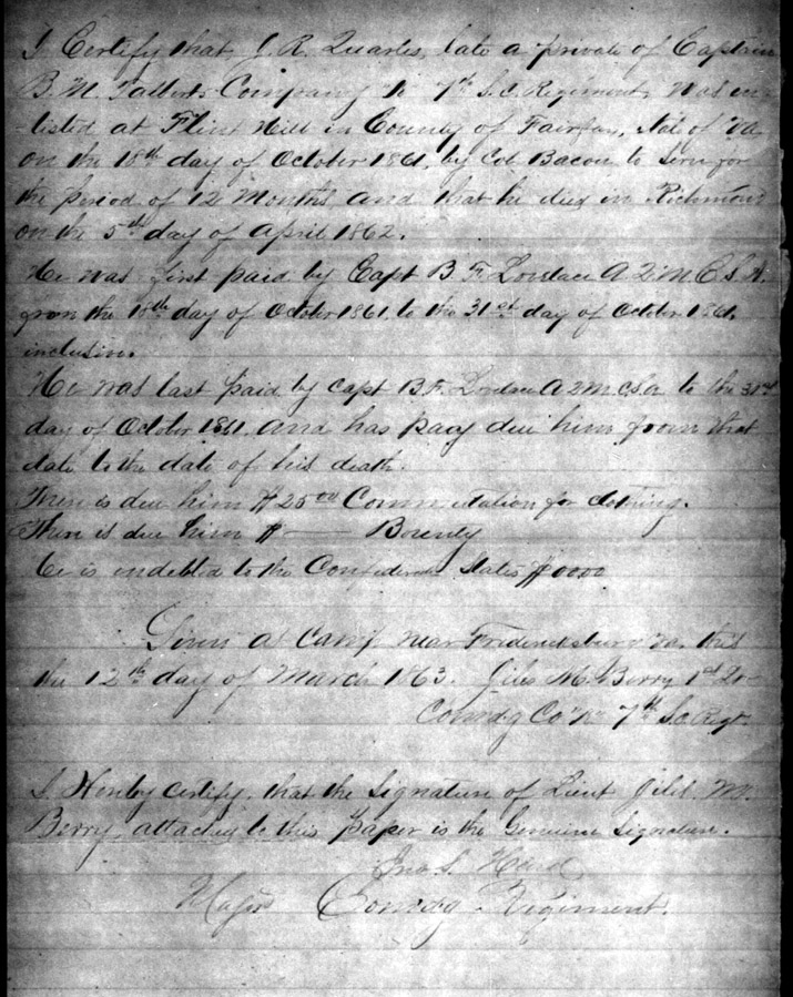 Memorandum certifying the death of Private J. Richard Quarles on April 5, 1862 at Richmond, signed by 1st Lt. Jiles M. Berry, commanding Co. K, and countersigned by Major John Stewart Hard, Commanding the 7th South Carolina Volunteer Infantry. The memorandum notes that Quarles was owed back pay from November 1, 1861 through the date of his death, along with a $25 commutation for clothing. Other documents in Quarles’ file note that these monies, totaling $81.83, were to be paid to his mother, Mary A. Fuller, of Edgefield, South Carolina. Via Footnote.