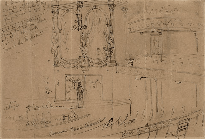 Image: Interior of Ford’s Theater, Washington, D.C., by A. R. Waud, April 1865. Waud’s annotations, intended for engravers, include descriptions of colors, the measurement of 11 feet 6 inches from the rail of the presidential box to the stage, and, “spot on which the man jumped.” Library of Congress.