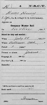 Harry Henry enlisted in Company E of the 4th U.S. Colored Infantry at Baltimore on July 28, 1863, a few weeks after recruitment for the USCTs began. He enlisted for a term of three years. At the time he gave his age as 21 years, his height as five-foot-seven, with a “black” complexion, black eyes and curly hair. His occupation was listed as “farmer.” It appears that on that same day Harry’s older brothers, Jacob and William, enlisted in the same company. Jacob would be wounded at New Market Heights on September 29, 1864, but eventually return to duty. Jacob was apparently a crack shot, as he spent much of his enlistment on detached service, away from the regiment, with a sharpshooters’ unit. Both Jacob and William would survive the war and, with Harry, muster out of the 4th USCT as a Sergeant and Corporal respectively, in May 1866.
