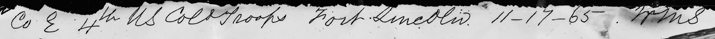 My reasoning was right, but my conclusion about the date was wrong. The image was not made during the 4th USCT’s working-up period. On the upper edge of the full image, available from the Library of Congress, the notation is scratched on the glass plate negative reads, “Co E 4th US Col’d Troops Fort Lincoln 11-17-65. WMS [William Morris Smith, the photographer].”: