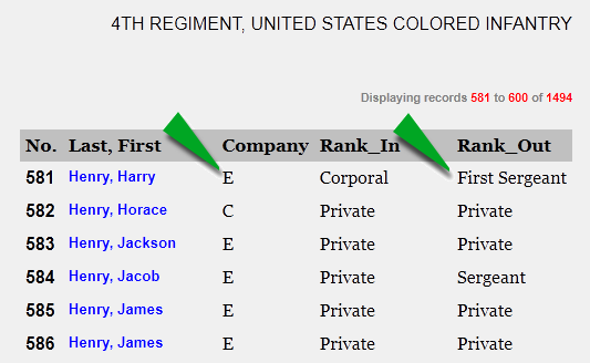 It’s actually a straightforward, two-step process. First, the NPS Soldiers & Sailors System database allows users to search by regiment, and pull up names of officers and enlisted men assigned to it. Helpfully, the database includes each soldier’s initial and final rank, so it’s a simple matter to identify a few likely candidates. Second, cross-check those men’s compiled service records via Footnote, to confirm each individual’s duty assignment and dates in rank. Using this method, it was quickly determined that in November 1865, the First Sergeant of Co. E, 4th USCT was First Sergeant Harry Henry. You can read his service record here, via Footnote (5.2MB PDF).