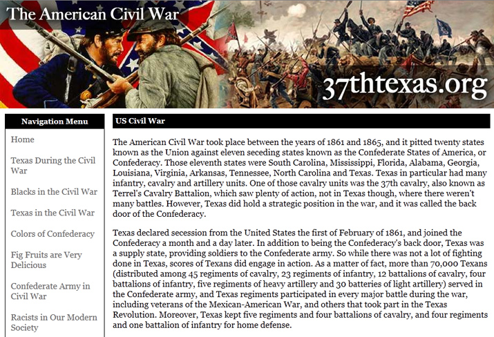 But I noticed recently a rather stark change that’s come over 37thTexas.org, which is (or perhaps was) the website of the reenactors of the 37th Texas (Terrell’s) Cavalry. It wasn’t exactly a favorite website of mine, but I found it extremely useful, collecting as it did in one place all sorts of cliched tropes and bad history. You can view the old website through the Internet Wayback Machine, but it has imbedded music so you may want to turn your speakers down. It was full of all sorts of useful stuff for a cynical blogger like me, with multiple sections on black Confederates, the Chandler Boys, Nathan Bedford Forrest at Fort Pillow, and that wicked old racist, Abraham Lincoln. That website was like an old friend — a drunk, belligerent, slightly-insane old friend.