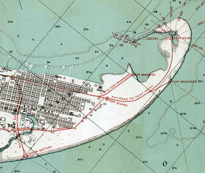 Confederate batteries and entrenchments at Galveston, as they appeared by the end of the war. Forts Scurry, Bankhead and Magruder were all set up during the first months of 1863, by the time of Colonel Fremantle’s visit in early May, and a new battery built to replace the original one at Fort Point. Eventually all were connected by rail and lines of earthworks, built by slave laborers hired or pressed from area planters. Official Records.