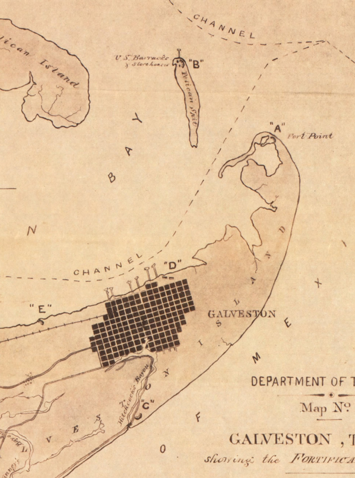 Chart of Galveston Defenses made by U.S. Assistant Engineer W. S. Long in December 1862, showing the island’s defensive works at that time. Library of Congress.