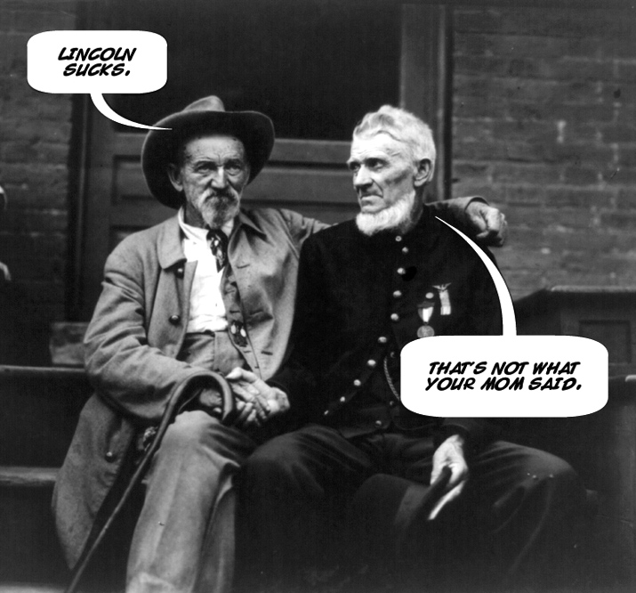 Gettysburg, Penn., July 2. — Seven men attending the Gettysburg Battle Celebration were stabbed to-night in the dining-room of the Gettysburg Hotel in a fight which started when several men aroused the anger of an old veteran in blue by abusing Abraham Lincoln.