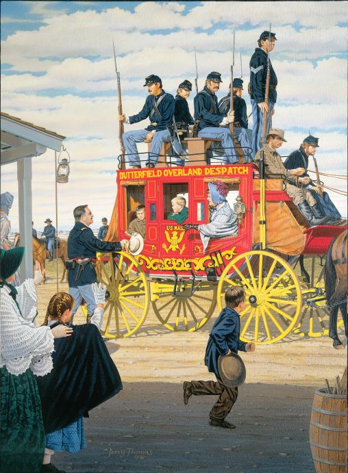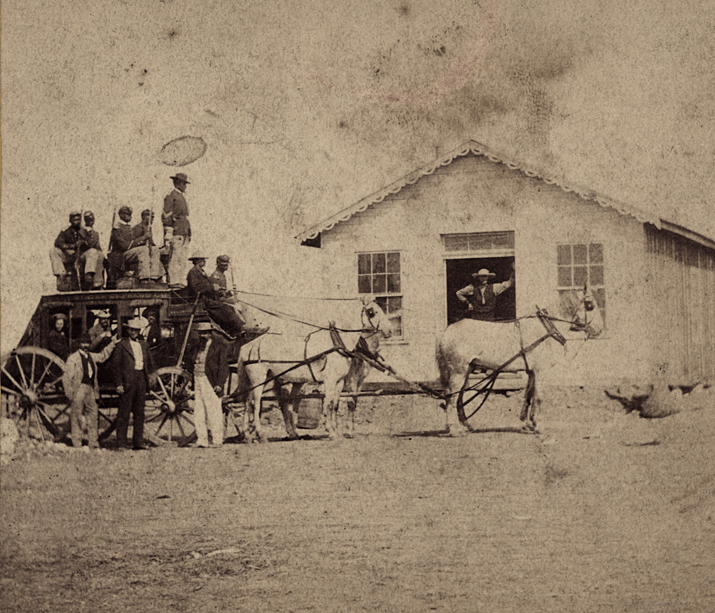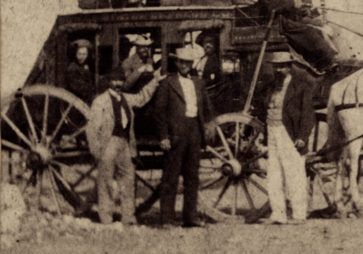 There are three men standing outside the coach — likely local worthies posing for Gardner — as well as four, possibly five, men inside. The bright white trousers and patterned vest of the man standing at right don’t suggest much of the frontier; perhaps he’s the stagecoach station agent, or a local merchant.