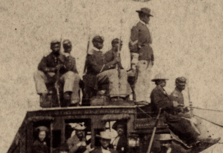 The Buffalo Soldiers serving as guards — five privates and a corporal, it looks like — appear to be dressed in frock coats with shoulder scales, and the “shotgun” looks to be wearing gloves besides — accoutrements better suited to a posed photo than a long, dusty ride across the prairie. Both Forts Harker and Hays had contingents of the Ben Grierson’s U.S. 10th Cavalry stationed there during this period, but Harker also a detachment from the 38th U.S. Infantry (later combined with the 41st Infantry to become the 24th Infantry). Wiki notes that “troops stationed at Fort Harker in 1867 performed more escorts of wagon trains in one year than troops stationed at any other frontier fort in the post-Civil War era,” and this image may reflect similar efforts on behalf of the stagecoach operating from there.