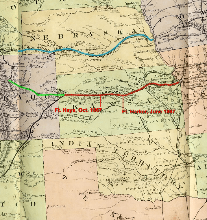 This detail from an 1868 Union Pacific Railroad map, from Kansas State University, shows the main line of the Union Pacific running west from Omaha along the Platte River (top, highlighted in blue), and the Eastern Division of the UP running a parallel course through Kansas (in red). The road route beyond Fort Wallace, to Denver, is shown in green. At the time of the map’s creation, the main line of the UP had just crossed the western boundary of Nebraska into the Dakota Territory — present-day Wyoming.