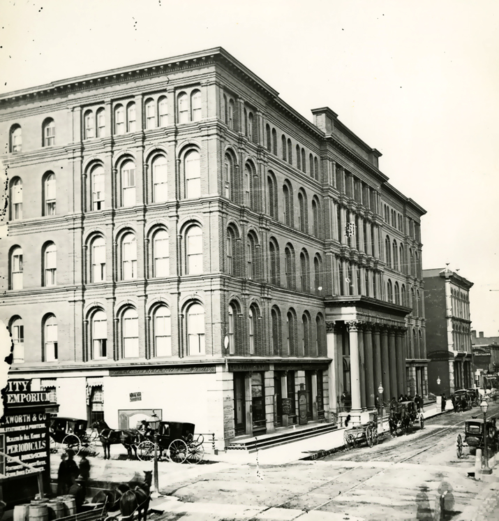 Maxwell House in Nashville, Tennessee, c. 1900. Forrest was sworn into the Ku Klux Klan here in the fall of 1866, and the first national meeting of the group was reportedly held here the following spring. The structure was destroyed in a fire on Christmas night, 1961. Image via Tennessee State Library and Archives.