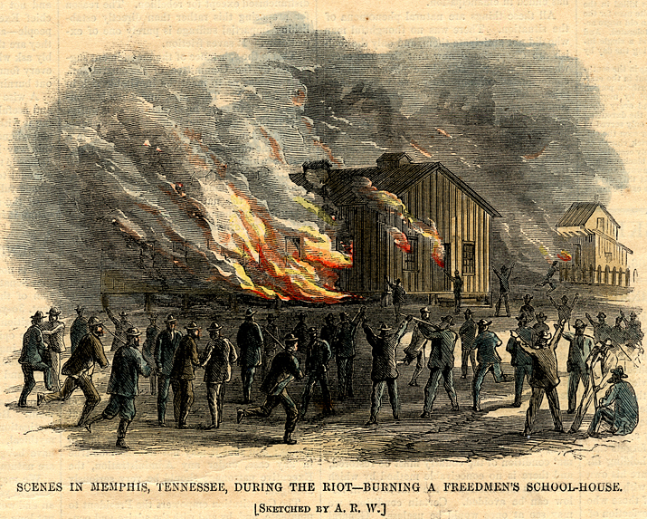 Engraving after a sketch by Alfred R. Waud in Harper’s Weekly, depicting some of the violence during rioting in Memphis in early May 1866. At the end of three days of violence, forty-eight people were dead — forty-six black, and two white. (One of the latter was killed by the accidental discharge of his own weapon.) Via Tennessee State Library and Archives.