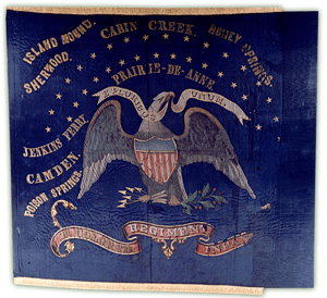 If you look closely at their regimental flag you can see that the 1st Kansas Colored were also along on Steele’s Camden Expedition in April 1864. Camden wasn’t actually part of the original itinerary. The goal was to meet up with Banks at Shreveport and push from there into Texas to Fort Worth. Banks was thwarted coming up the Red River. Steele’s forces were diverted east to Camden, AR where they regrouped, awaiting news from Banks. When it was clear Banks wasn’t coming, Steele returned to Little Rock, but not without some serious scrapes. The 1st Kansas Colored took heavy casualties at Poison Spring and a few weeks later at Jenkin’s Ferry, fighting alongside units led by Germans, including Adolph Dengler’s 43rd Illinois, Frederick Salomon’s 9th Wisconsin and the 27th Wisconsin led by Konrad Krez, all part of Engelmann’s brigade.