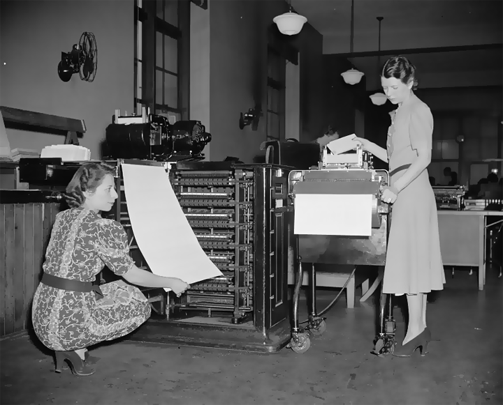_____________From the original caption: “Herman Hollerith invented a ‘unit tabulator,’ shown on left of photo being operated by Operator Ann Oliver. This machine is fed cards containing census information at the rate of 400 a minute and from these, 12 separate bits of statistical information is extracted. Not so long ago, Eugene M. La Boiteaux, Census Bureau inventor, turned out a smaller, more compact machine, which extracts 58 statistics from 150 cards per minute. This machine is shown on the right and is being operated by Virginia Balinger, Assistant Supervisor of the current Inquiry Section. With the aid of this machine, statistical information from the 1940 census is expected to be compiled in 2 1/2 years.” Library of Congress.