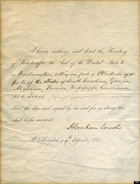 A document signed by President Abraham Lincoln ordering Union blockades of Confederate ports, marking the official start of the Civil War, is for sale. The Raab Collection in Philadelphia said Tuesday it is selling the document, which it calls one of the most important in American history. The asking price is $900,000. Lincoln’s proclamation is dated April 19, 1861 – a week after the first shots of the conflict were fired at South Carolina’s Fort Sumter. After the Civil War ended in 1865, the U.S. Supreme Court in an opinion ascribed Lincoln’s April 19 blockade order as the official beginning of the war. . . . The document, which has been owned by a private collector who wishes to remain anonymous, was exhibited recently at museums including the National Constitution Center in Philadelphia and the Abraham Lincoln Presidential Museum and Library in Springfield, Ill. The single-page manuscript authorizes Lincoln’s secretary of state to “affix the Seal of the United States to a Proclamation setting on foot a Blockade of the ports of the States of South Carolina, Georgia, Alabama, Florida, Mississippi, Louisiana, and Texas.” The seal was affixed to the blockade proclamation announced that day, effectively declaring war on the Confederacy.