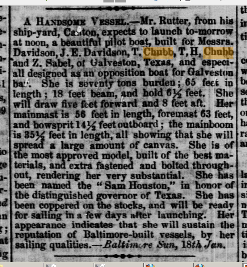 A Handsome Vessel. — Mr. Rutter, from his ship-yard, Canton [Maryland], expects to launch to-morrow at non, a beautiful pilot boat, built for Mssrs. Davidson, J. E. Davidson, T. Chubb, T. H. Chubb, and Z. Sabel, of Galveston, Texas, and especiall[y] designed as an opposition boat for the Galveston bar. She is seventy tons burden; 65 feet in length; 18 feet beam; and hold 6 1/2 feet. She will draw five feet forward and 8 feet aft. Her mainmast is 56 feet in length, foremast 63 feet, and bowsprit 14 1/2 feet outboard; the main boom is 35 1/2 feet in length, all showing that she will spread a large amount of canvas. She is of the most approved model, built of the best materials, and extra fastened and bolted throughout, rendering her very substantial. She has been named Sam Houston in honor of the distinguished governor of Texas. She has been coppered on the stocks, and will be ready for sailing in a few days after launching. Her appearance indicates that she will sustain the reputation of Baltimore-built vessels, by her sailing qualities. — Baltimore Sun, 18th Jan.