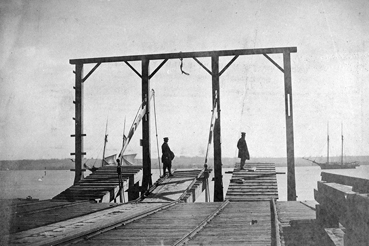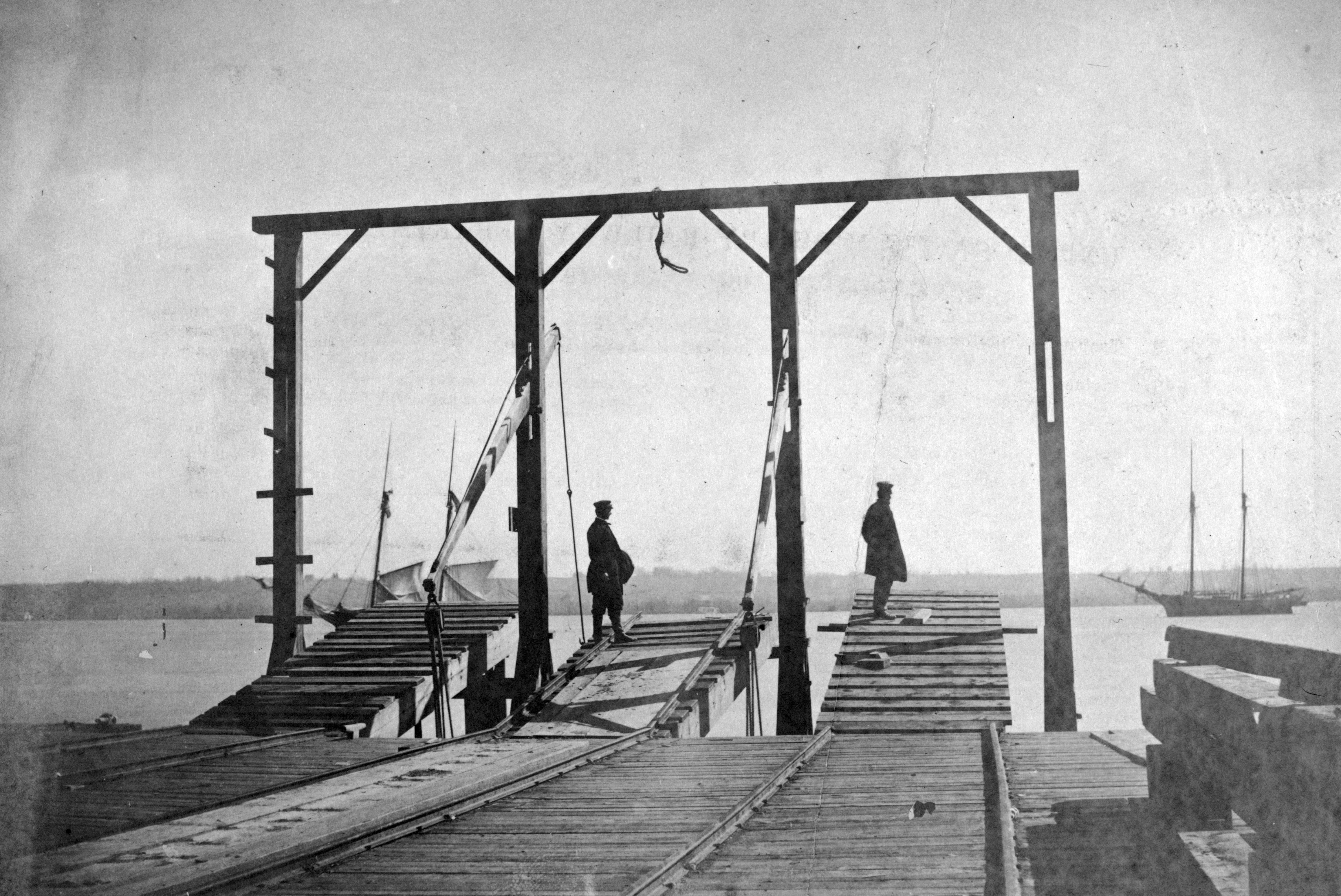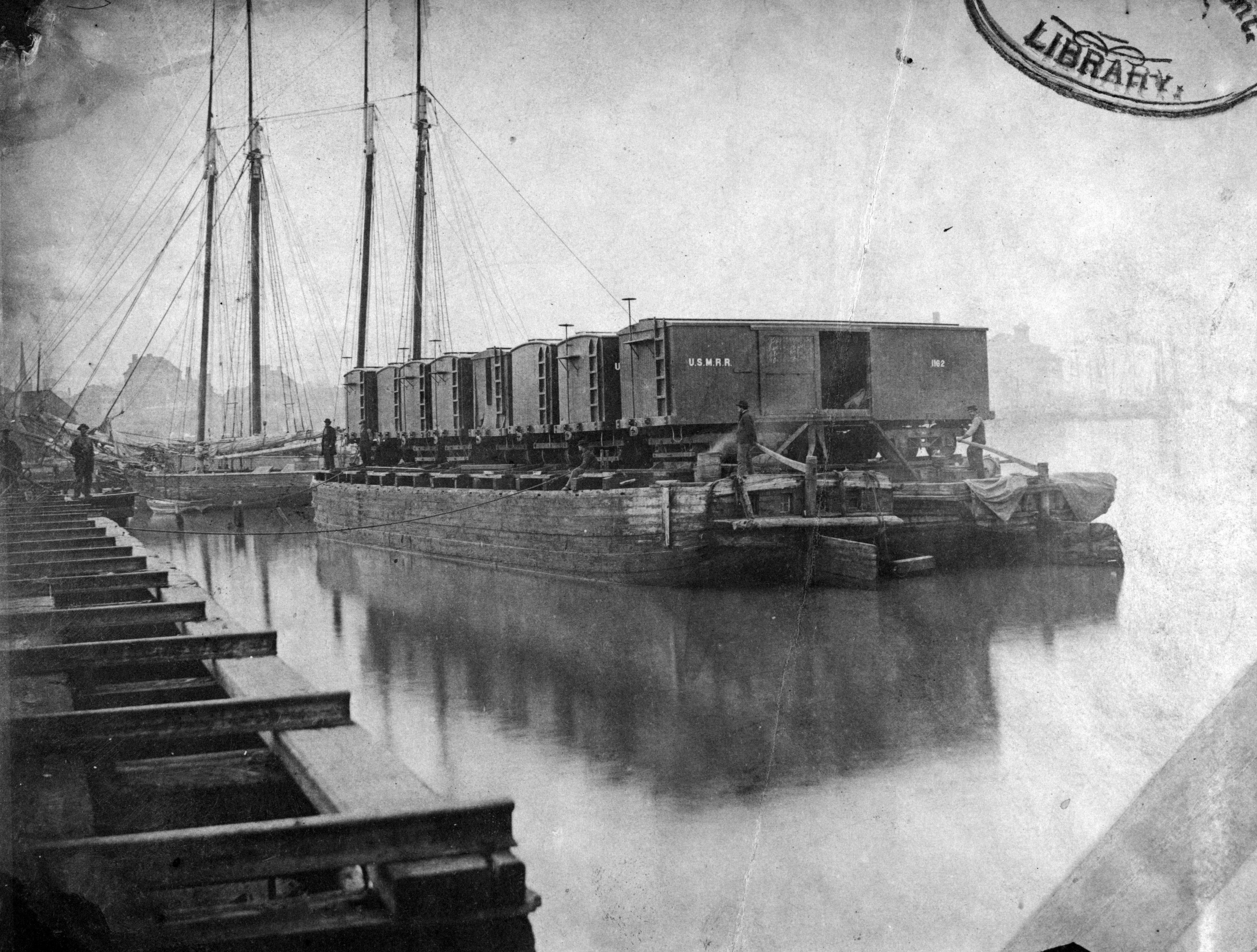 Further digging at the LoC shows the image I posted earlier Saturday to be one of a series taken at Alexandria by Andrew Russell, documenting the U.S. Military Railroad. You can see more of them here. One in particular includes a caption explaining that “cars loaded at Alexandria can be carried on barges or arks to Aquia Creek, and sent to stations where the Army of the Potomac is supplied, without break of bulk.”