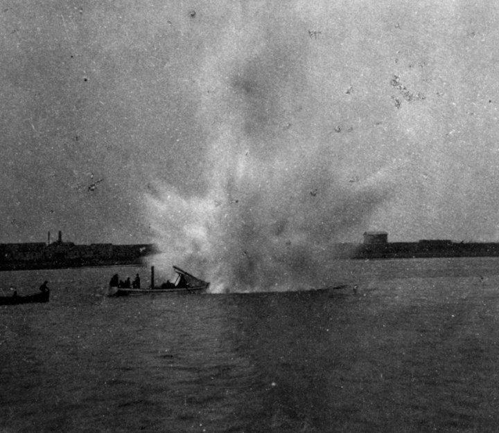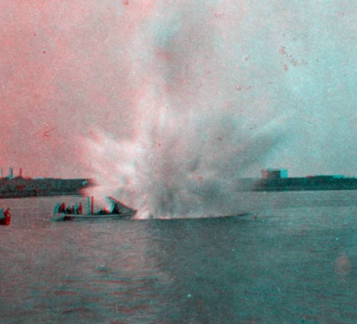 My colleague Chubacus from CivilWarTalk.com posted this image, subsequently identified by CWT user lordroel, of U.S. Navy tests of a spar torpedo at Newport, Rhode Island on September 11, 1871. The note on the back of the image gives the size of the charge as 160 lbs, about 20% more than used by the Confederate submersible H. L. Hunley in sinking USS Housatonic in February 1864. It was a steam launch very much like this that sank CSS Albemarle.