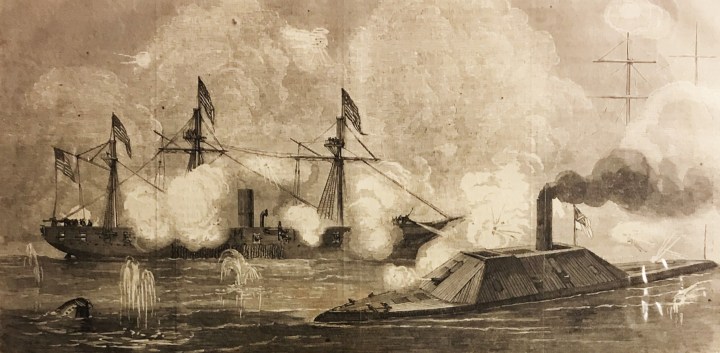 Here, the Confederate ironclad Tennessee engages the U.S. Steam Sloop Richmond. Illustrations like this are often more fanciful than authentic, but in this case there’s some interesting detail, like the chain mesh draped over the midships section of Richmond to protect her boiler and machinery spaces.