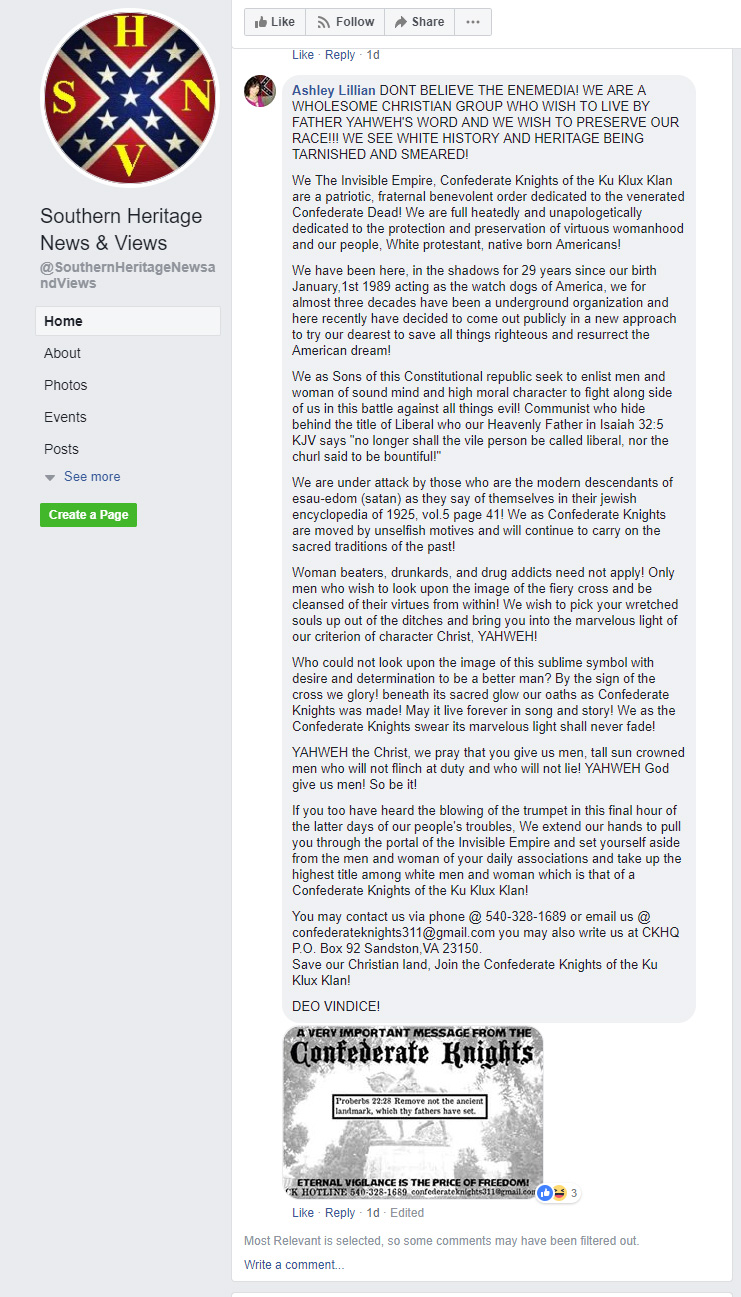 Finally, in response to a posting about the Dallas lawsuit at the Southern Heritage News & Views, there are a long series of responses promoting the white identity movement, rancidly anti-Semetic tropes, and straight-up advertising for the Confederate Knights of the Ku Klux Klan. (Here’s a screen shot of that last one, in the event it gets taken down.) Useful to know who these folks are, what they believe, and who they are willing to have in their ranks.