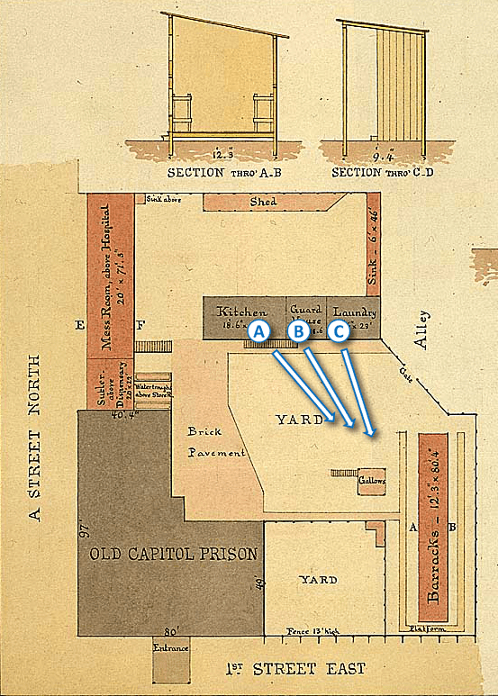 Plan of the Old Capitol Prison, showing the approximate positions of Gardner’s camera during the Wirz execution sequence. The plan is undated (from here), but shows the facility during its use as a prison during and immediately after the Civil War, 1861-67.