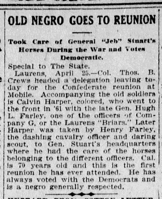 I’ve discussed in previous posts how, when one digs a little into the stories of old African American men who attended Confederate reunions, there’s often a subtext that tells as much about the how the men were perceived at the time of the reunion as it does about their role during the war. What does this item, from the Columbia, South Carolina State newspaper from April 26, 1910, tell readers about Mr. Harper’s wartime status? What distinctions does the paper draw (or imply) between Mr. Harper and the “old soldiers?” What does it say, that this is a news item in 1910? More important, what does it suggest about how he was viewed by white Confederate veterans in 1910?