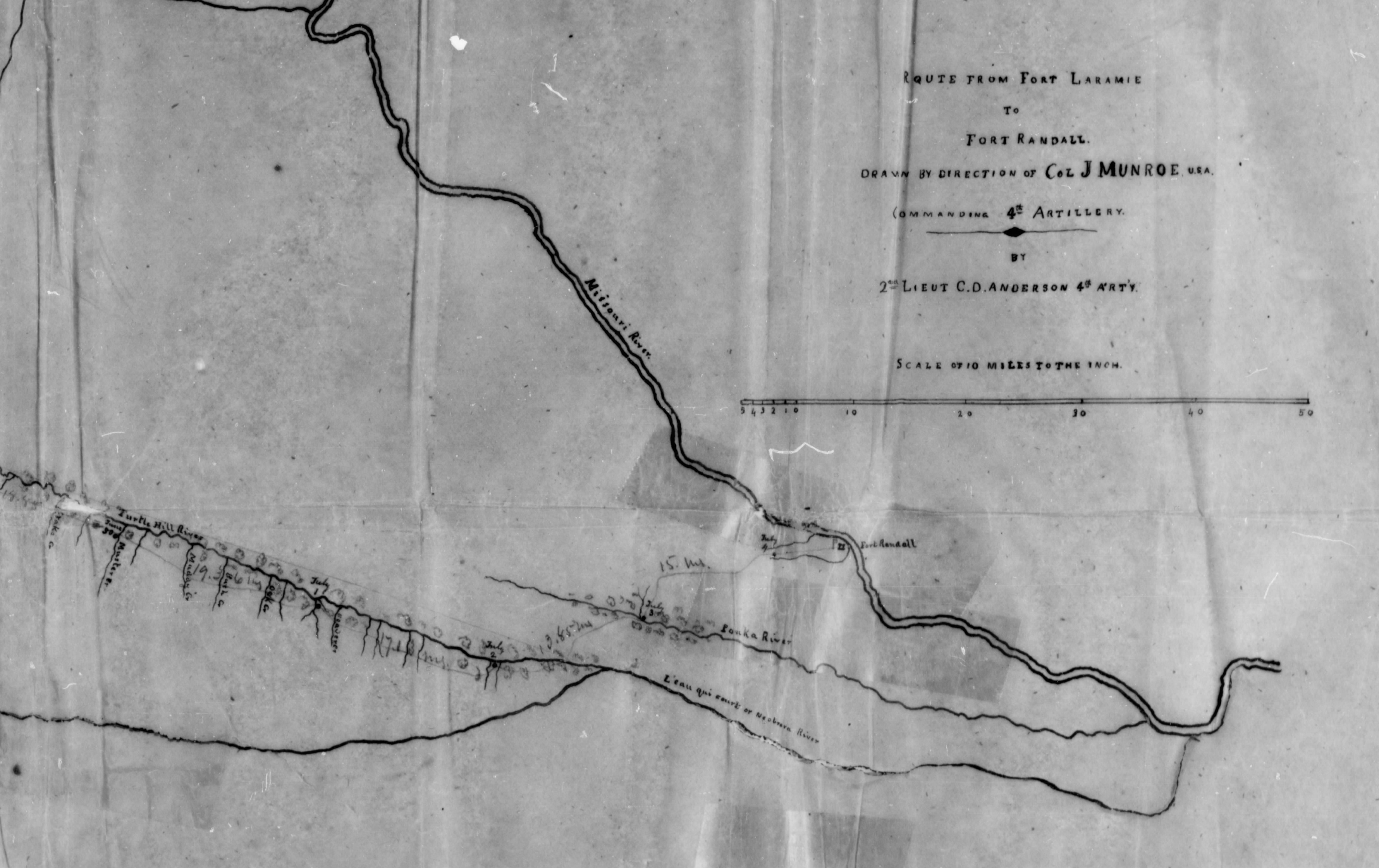 What fewer people know about Anderson is that he and his younger brother arrived in Texas as orphans, their parents having died on the ship en route to the Republic of Texas in 1839. They were adopted right there on the wharf by an Episcopal minster. In 1846, Anderson was the first cadet admitted to West Point from the newly-established State of Texas; his application letter was endorsed by U.S. Senator Sam Houston. Although Anderson did not graduate from the Point, he eventually received a direct commission into the Fourth U.S. Artillery in 1856, and served until resigning his commission in 1861. Anderson served longer as a U.S. Army officer than as a Confederate one; you can view a detail of an 1859 map drawn by Anderson of the area around Fort Randall, Dakota Territory, here.