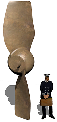 In the meantime, here’s the screw from C.S.S. Alabama, the high-seas raider built by Laird at Birkenhead in 1862. Although fitted out as a steamship, Alabama was intended to spend most of her time at sea under sail to conserve fuel, and so (like many ships of that period) was fitted with a “lifting” screw that could be disconnected from the shaft and hoisted almost entirely out of the water to reduce drag. Alabama‘s screw was 14 feet 3 inches (4.34m) in diameter. This model is based on plans in Andrew Bowcock’s authoritative C.S.S. Alabama: Anatomy of a Confederate Raider, which in turn are based on shipyard-built presentation model of the ship. Ship’s trials data for Alabama are missing, but based on the models and builders’ trials of contemporary vessels, Bowcock suggests that Alabama‘s screw had a pitch angle of 35°, a “slip” — a measure of the difference between the distance that a propeller of a given pitch should have moved forward (as the result of a full rotation) and the distance that it actually moved forward — of 15-20%, and operated at full speed at 60-65 rpm. Alabama‘s screw would have been more technically refined that Merrimac/Virginia‘s, but closer than the one shown in the renders below.