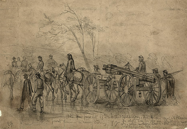 Image: “The pursuit of Gen. Lee’s rebel army. The heavy guns – 30 pounders – going to the front during a rain storm.” Library of Congress. I like this drawing for several reasons. First, it’s a relatively unusual depiction of soldiers on the march; most contemporary drawing either show soldiers in battle or in camp. Second, it shows soldiers in miserable weather, a driving rainstorm — note the reflections in the wet, muddy ground and the wind-whipped trees. (The soldiers look pretty damn miserable to me.) Third, it shows heavy artillery configured for transport, including having the gun tube shifted back on the carriage to provide a more stable center-of-gravity. All in all, it’s highly unusual image that depicts an all-too-common scene familiar to soldiers in both gray and blue.