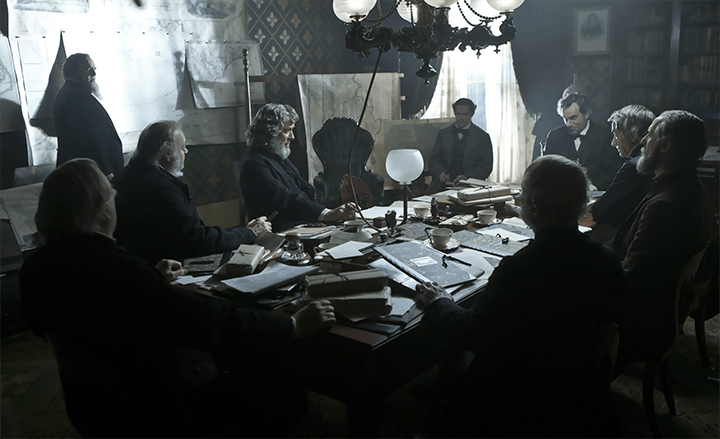 ______________Image: Lincoln (Daniel Day-Lewis) and his cabinet are briefed on the plans for the bombardment of Fort Fisher by Secretary of War Stanton (standing left, played by Bruce McGill).