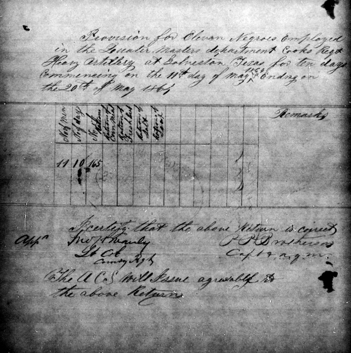 Note that the critical phrase “Negro Cooks Regiment,” as quoted by the researcher, does not appear in the document, which is a routine statement of rations drawn for conscripted laborers. The actual text reads, “Provision for Eleven Negroes Employed in the Quarter Masters department Cooks Regt Heavy Artillery at Galveston Texas for ten days commencing on the 11th day of May 1864 & Ending on the 20th of May 1864.” There’s a similar document in the same collection, covering the period May 21 to 31, as well.