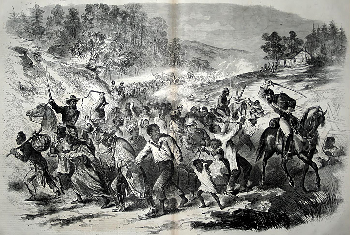 A November 1862 Harper’s Weekly (New York) illustration showing Confederate officers driving slaves further south, to put them out of reach of the Federal armies in advance of the Emancipation Proclamation. The accompanying article told of two white men who escaped to Union lines and