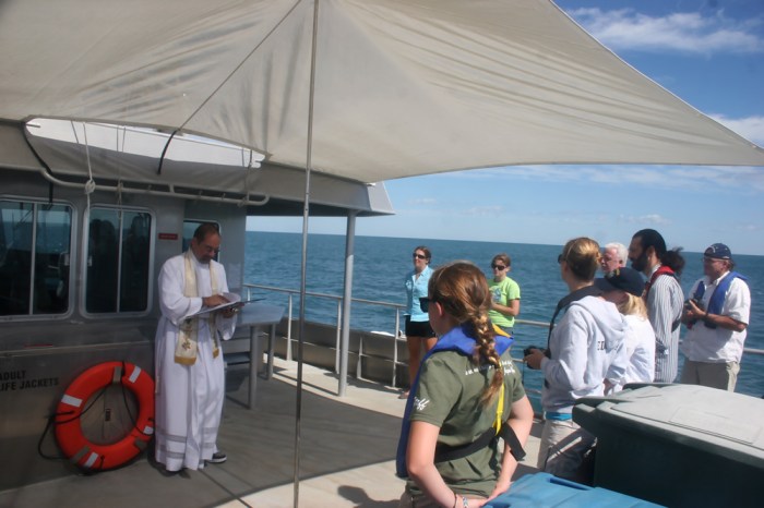 September 10, 2012. Fr. Stephen Duncan of Galveston, Texas conducts a memorial service for U.S.S. Hatteras Fireman John G. Cleary and Coal Heaver William Healy, who died in the battle with C.S.S. Alabama, January 11, 1863. This service, conducted over the wreck of Hatteras, is believed to be the first to honor these men, both of whom were Irish immigrants. The service marked the beginning of an intensive survey of the wreck conducted by a team of archaeologists and technicians assembled by NOAA, that will create a three-dimensional sonar map to document the storm-exposed remains of the USS Hatteras. The wreck itself will not be disturbed, and no artifacts will be recovered. The wreck is a protected site, and because the remains of the two crewmen were never recovered, the site is considered to be a war grave.
