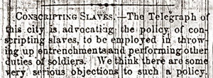 Conscripting Slaves. — The Telegraph of this city [Houston] is advocating the policy of conscripting slaves, to be employed in throwing up entrenchments and performing the other duties of soldiers. We think there are some very serious objections to such a policy. We do not propose to enter upon the discussion of the subject, but would here simply remark that by adopting such a policy we would seem to be following the example of the enemy, and they would not fail to justify the course they are now pursuing in filling up their armies with negro [sic.] recruits, by referring to the fact that we make conscripts of our slaves in order to strengthen our armies against them. The fact of our not putting arms in the hands of slaves, would not deprive their argument of its force, so long as the slaves are employed to the usual duties of soldiers, so that the 100,000 of them the Telegraph proposes to raise, will have the same effect as increasing our military force by just that number of white conscripts. We fear the argument would, at least, be sufficient with foreign nations, to justify the Federals in employing negroes in their armies, in the way they are now doing.