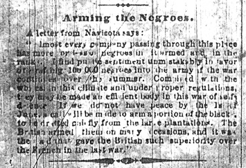 Almost every company passing through this place has more or less negroes [sic.] in it armed and in the ranks. I find public sentiment unmistakably in favor of drafting 100,000 negroes into the army if the war continues over this summer. Combined with the white men in this climate and under proper regulations, they may be made an efficient body in this war of self-defence. If we do not have peace by the 1st of June, a call will be made to arm a portion of of the blacks to be drafted chiefly from the large plantations. The British armed them on many occasions, and it was the [ad?] that gave the British such superiority over the French in the last war.