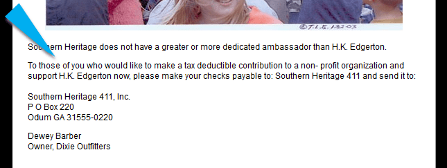 As to the “unkind words spoken here” about Mr. Edgerton, it’s actually more serious than that. I’ve directly challenged claims made by Edgerton and others that his organization, Southern Heritage 411, actually holds non-profit status, or that contributions to it are tax-deductible. I can find no evidence that either of these things are true. I’m no lawyer, but I can’t help but think that if Southern Heritage 411 is, in fact, the for-profit corporation that it claimed to be in filings with the Georgia Secretary of State, Mr. Edgerton has made a very “serious mistake” of his own.