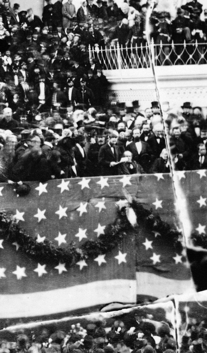President Grant reads his Second Inaugural Address at the East Front of the Capitol, March 4, 1873. Seated, bareheaded, to Grant’s immediate left is Chief Justice Salmon P. Chase, who had run against Grant the previous November. Image: Library of Congress.