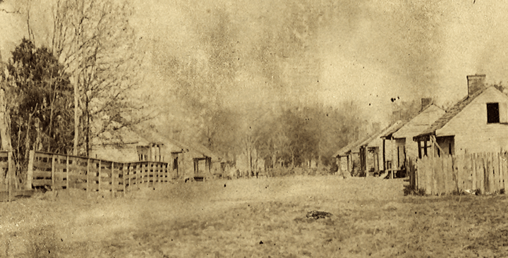 Slave quarters on Jefferson Davis’ plantation, Library of Congress.