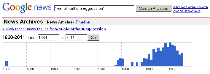 Google News can be used to track the appearance of words and phrases in its archive of hundreds of thousands of pages of historic newspapers, going back through the 19th century and beyond. Not only is “the War of Northern Aggression” a term that was not widely used at the time of the war, it didn’t come into wide use for nearly a century after, from the mid-1950s on. In Google’s indexing, it appears exactly once during the conflict, describing the war, not as a proper name as it is commonly seen today. (The single example in the 19th century comes from an 1862 speech by Union General John Alexander McClernand, who cautioned Tennesseans that “you have been told, gentlemen, that this is a war of Northern aggression. I deny it. It is no war of aggression. It is a war of defence, of defence of our common Constitution and Union.”)
