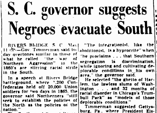 Other large newspaper databases return similar results. GenalogyBank (a subscription service), turns up the earliest reference to “the War of Northern Aggression” in a May 12, 1956 article (above) in the Augusta, Georgia, Chronicle (“S.C. Governor Suggests Negroes Evacuate South”), in which the phrase is set off in quotes, and the governor warns about Northerners “stirring racial strife in the South.”