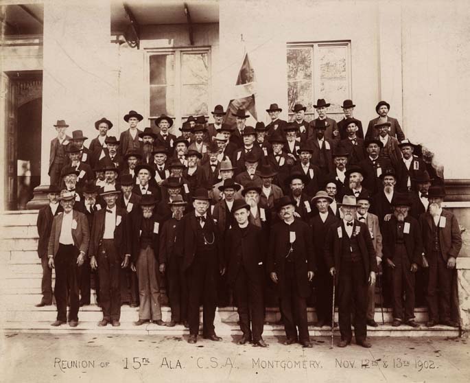 The deeply shallow “research” to prove the existence of black Confederates continues apace. This image, from the Alabama Department of Archives and History, is of men from the 15th Alabama Infantry attending a statewide Confederate veterans reunion in Montgomery, in November 1902. The 15th Alabama, many will recall, is the regiment that made repeated attempts to dislodge the Union flank on Little Round Top on the second day at Gettysburg, facing the famous 20th Maine Infantry. I believe the former commander of the 15th Alabama, William C. Oates, is the first man at left in the front row in the image, directly above the C in “C.S.A.”