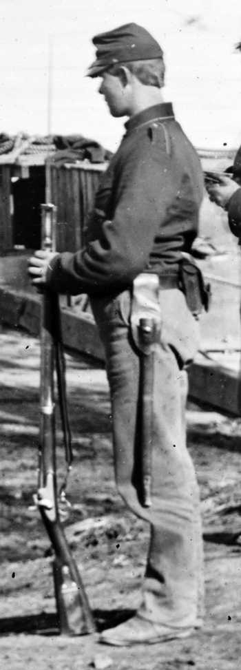 Not long ago I used a Library of Congress image of the ferry connecting Mason’s Island (now Theodore Roosevelt Island) to Georgetown. But looking more closely at that image, I keep coming back to one of the privates at the landing, standing guard while his colleagues check the passes of people coming off the ferry. There’s nothing particular about his pose; he’s standing in profile, facing to the left, seemingly oblivious to the photographer capturing his likeness. But even though I know next to nothing about period firearms, his weapon strikes me as unusual. Is that a patch box on the stock? What sort of bayonet is that? Do these details provide clues as to his unit?