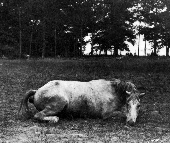 The wounded Rebels had been carried away in great numbers and yet every farmyard and haystack seemed a large hospital. The number of dead horses was high. They lay, like the men, in all attitudes. One beautiful milk-white animal had died in so graceful a position that I wished for its photograph. Its legs were doubled under and its arched neck gracefully turned to one side, as if looking back to the ball-hole in its side. Until you got to it, it was hard to believe the horse was dead.