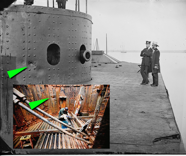 Top color photo: “Dave Krop, who manages the Monitor conservation project, works inside the inverted turret at the Mariner’s Museum. Visitors can watch the work from viewing platforms or online.” Credit: Steve Earley, the Virginian-Pilot. Archival photo: Library of Congress. Bottom photo: Diorama of interior of Monitor‘s turret in action by Sheperd Paine, from U.S.S. Monitor: The Ship that Launched a Modern Navy by Lt. Edward M. Miller, USN.