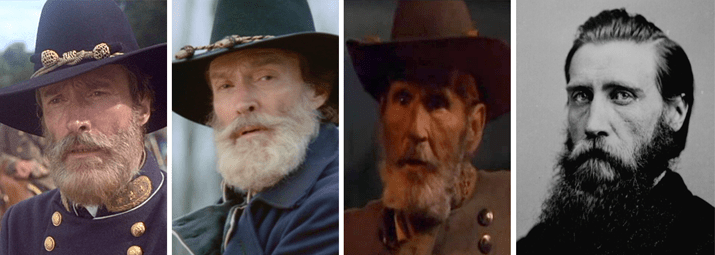 Hood as portrayed by (l. to r.) Patrick Gorman in Gettysburg (1993) and Gods and Generals (2003), Levon Helm in In the Electric Mist (2009) and himself in real life (c. 1865).